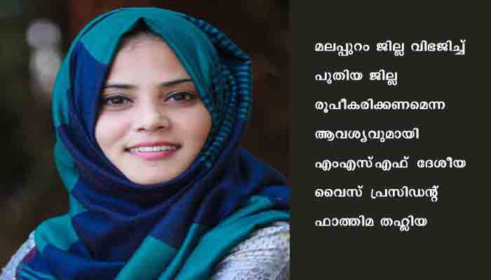 മലപ്പുറം ജില്ല വിഭജിച്ച്‌ പുതിയ ജില്ല രൂപീകരിക്കണം : എംഎസ്‌ എഫ്‌ ദേശീയ വൈസ്‌ പ്രസിഡന്റ് ഫാത്തിമ തഹ്‌ലിയ