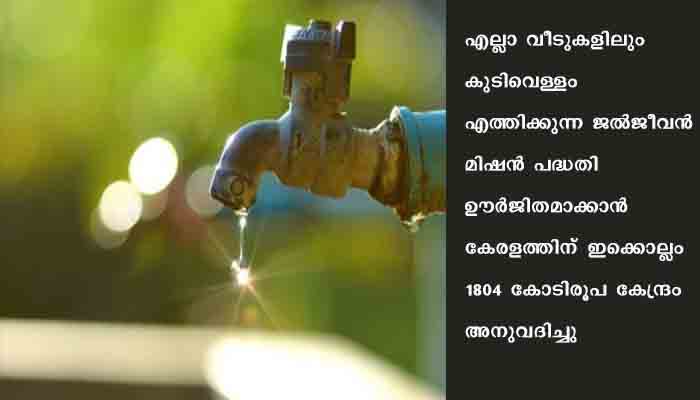 ന്യൂഡൽഹി: എല്ലാ വീടുകളിലും കുടിവെള്ളം എത്തിക്കുന്ന ജൽജീവൻ മിഷൻ പദ്ധതി ഊർജിതമാക്കാൻ കേരളത്തിന് ഇക്കൊല്ലം 1804 കോടിരൂപ കേന്ദ്രം അനുവദിച്ചു. 2021-22 വർഷത്തേക്കാണ് ഈ തുക. കഴിഞ്ഞ സാമ്പത്തികവർഷം അനുവദിച്ചത് 404.24 കോടിയായിരുന്നു.