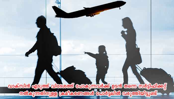 ഇപ്പോൾ, വാക്സിൻ എടുത്ത് വിദേശത്ത് പോകുന്നവർക്ക് ഉടൻ തന്നെ സർട്ടിഫിക്കറ്റ് നൽകുന്നതിനുള്ള ക്രമീകരണങ്ങൾ പോർട്ടലിൽ വരുത്തിയിട്ടുണ്ട്. വാക്സിൻ നൽകി കഴിയുമ്പോൾ വ്യക്തിയുടെ രജിസ്റ്റർ ചെയ്ത മൊബൈൽ നമ്പറിൽ, സർട്ടിഫിക്കറ്റ് നമ്പർ അടങ്ങിയ എസ്എംഎസ് ലഭിക്കും. ഉടൻ തന്നെ അവർക്ക് പോർട്ടലിൽ നിന്നും സർട്ടിഫിക്കറ്റ് ഡൗൺലോഡ് ചെയ്യാം. കൂടുതൽ വിവരങ്ങൾക്ക് ദിശ 1056, 104.