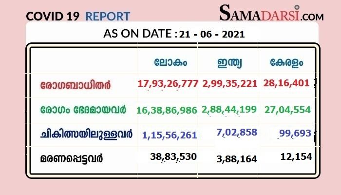 കഴിഞ്ഞ ദിവസങ്ങളിലുണ്ടായ 94 മരണങ്ങളാണ് കോവിഡ്-19 മൂലമാണെന്ന് 21/06/2021 തിങ്കളാഴ്ച സ്ഥിരീകരിച്ചത്. ഇതോടെ ആകെ മരണം 12,154 ആയി.