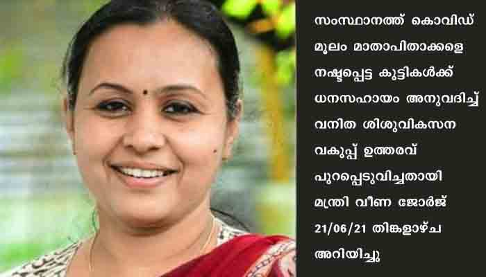 തിരുവനന്തപുരം: സംസ്ഥാനത്ത് കൊവിഡ് മൂലം മാതാപിതാക്കളെ നഷ്ടപ്പെട്ട കുട്ടികള്ക്ക് ധനസഹായം അനുവദിച്ച് വനിത ശിശുവികസന വകുപ്പ് ഉത്തരവ് പുറപ്പെടുവിച്ചതായി മന്ത്രി വീണ ജോര്ജ് 21/06/21 തിങ്കളാഴ്ച അറിയിച്ചു. കൊവിഡ് ബാധിച്ച് മാതാപിതാക്കള് രണ്ട് പേരും മരണപ്പെട്ട കുട്ടികള്ക്കും അതോടൊപ്പം നേരത്തെ മാതാപിതാക്കളില് ഒരാള് മരണപ്പെടുകയും ശേഷിച്ച ആള് ഇപ്പോള് കൊവിഡ് മൂലം മരണപ്പെട്ട് രക്ഷിതാക്കള് പൂര്ണമായും നഷ്ടപ്പെട്ടതുമായ എല്ലാ കുട്ടികള്ക്കുമാണ് സഹായം അനുവദിക്കുന്നത്.