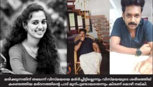 തിങ്കളാഴ്ച പുലര്ച്ചെയാണ് വിസ്മയയെ ശാസ്താംകോട്ട ശാസ്താംനടയിലെ ഭര്തൃഗൃഹത്തില് ദുരൂഹ സാഹചര്യത്തില് തൂങ്ങിമരിച്ചനിലയില് കണ്ടത്. മകളെ ഭര്ത്താവ് കിരണ്കുമാര് കൊലപ്പെടുത്തിയത് തന്നെയാണെന്നാണ് പിതാവിന്റെയും സഹോദരന്റെയും ആരോപണം. 2020 മെയ് 31 നായിരുന്നു വിസ്മയയും കിരണ്കുമാറും തമ്മിലുള്ള വിവാഹം.