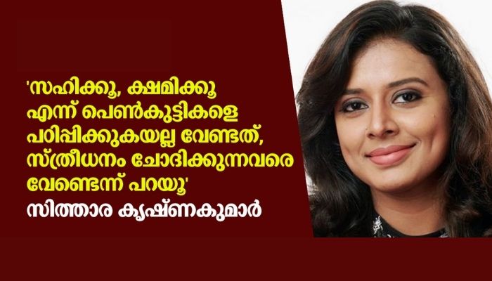 കൊല്ലത്ത് ഭര്തൃവീട്ടില് വിസ്മയയെ മരിച്ച നിലയില് കണ്ടെത്തിയ സംഭവത്തില് പ്രതികരണവുമായി ഗായിക സിത്താര കൃഷ്ണകുമാര്. സഹിക്കൂ, ക്ഷമിക്കൂ എന്നുപറഞ്ഞു പെണ്കുട്ടികളെ പഠിപ്പിക്കുകയല്ല വേണ്ടത്. കല്യാണമല്ല ജീവിതത്തിന്റെ ഒരേയൊരു ലക്ഷ്യം. സ്ത്രീധനം ചോദിക്കുന്നവരെ ജീവിതത്തില് വേണ്ടെന്ന് പെണ്കുട്ടികള് പറയണമെന്നും സിത്താര പറഞ്ഞു.