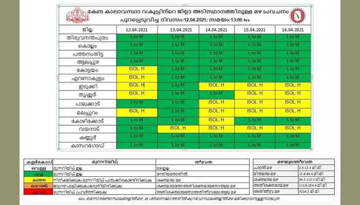 എന്നീ ജില്ലകളിൽ മഞ്ഞ അലേർട്ട് പ്രഖ്യാപിച്ചു. ഒറ്റപ്പെട്ട ശക്തമായ മഴയ്ക്കുള്ള സാധ്യതയാണ് പ്രവചിക്കപ്പെട്ടിരിക്കുന്നത്. 24 മണിക്കൂറിൽ 64.5 മില്ലിമീറ്റർ മുതൽ 115.5 മില്ലിമീറ്റർ വരെ മഴ ലഭിക്കുന്ന സാഹചര്യത്തെയാണ് ശക്തമായ മഴ എന്നത് കൊണ്ട് വിവക്ഷിക്കുന്നത്.