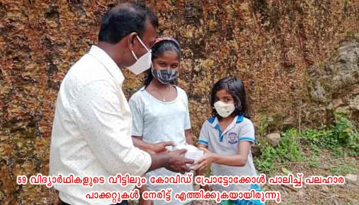 ഹെഡ്മാസ്റ്റര് കെ. പ്രകാശനും, പി.ടി.എ പ്രസിഡന്റായ ഇ.വി ജോഷിയും സ്കൂളിലെ 59 വിദ്യാർഥികളുടെ വീട്ടിലും കോവിഡ് പ്രോട്ടോക്കോള് പാലിച്ച് പലഹാര പാക്കറ്റുകള് നേരിട്ട് എത്തിക്കുകയായിരുന്നു.