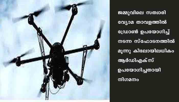ന്യൂ ഡല്‍ഹി : ജമ്മുവിലെ സത്വാരി വ്യോമ താവളത്തില്‍ ഡ്രോണ്‍ ഉപയോഗിച്ച്‌ നടന്ന സ്ഫോടനത്തില്‍ മൂന്നു കിലോയിലധികം ആര്‍ഡിഎക്‌സ്‌ ഉപയോഗിച്ചതായി നിഗമനം. സ്ഫോടനത്തിന്റെ തീവ്രതകൂട്ടാനാണ്‌ ഇത്രയധികം ആര്‍ഡിഎക്‌സ്‌ ഉപയോഗിച്ചതെന്ന്‌ ദേശീയ അന്വേഷണ ഏജന്‍സിയുടെ കണ്ടെത്തല്‍. . ഒന്നര കിലോ വീതം ആര്‍ഡിഎക്‌സ്‌ വച്ച ഐഇഡികള്‍ രണ്ട്‌ ജിപിഎസ്‌ നിയന്ത്രിത ഡ്രോണുകളില്‍ കൊണ്ടുവന്ന്‌ സ്ഫോടനം നടത്തിയെന്നാണ്‌ നിഗമനം.