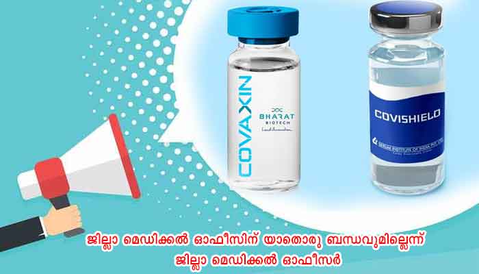 തൃശ്ശൂർ: സ്വകാര്യ സ്ഥാപനങ്ങൾ വഴി നൽകുന്ന കോവിഡ്-19 വാക്സിൻ ‘സിറം ഇൻസ്റ്റിറ്റ്യൂട്ട് ഓഫ് ഇൻഡ്യ’ യിൽ നിന്ന് സ്വകാര്യ സ്ഥാപനങ്ങൾ നേരിട്ട് വാങ്ങിയാണ് പൊതുജനങ്ങൾക്ക് നിശ്ചിത നിരക്കിൽ വിതരണം ചെയ്യുന്നത്. ഇതുമായി ജില്ലാ മെഡിക്കൽ ഓഫീസിന് യാതൊരു ബന്ധവുമില്ലെന്ന് ജില്ലാ മെഡിക്കൽ ഓഫീസർ അറിയിക്കുന്നു.