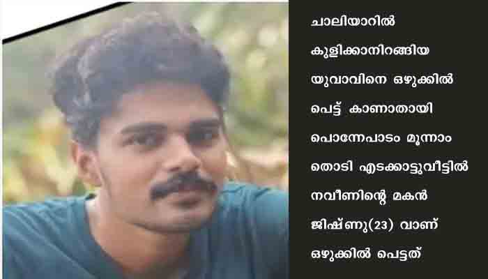കോഴിക്കോട് : ചാലിയാറില് കുളിക്കാനിറങ്ങിയ യുവാവിനെ ഒഴുക്കില് പെട്ട് കാണാതായി പൊന്നേപാടം മൂന്നാംതൊടി എടക്കാട്ടുവീട്ടില് നവീണിന്റെ മകന് ജിഷ്ണു(23) വാണ് ഒഴുക്കില് പെട്ടത്. കാരോട് പൊന്നേപാടം മണക്കടവിലാണ് അപകടം. 2021 ജൂലൈ 13ന് വൈകിട്ട് സുഹൃത്തുക്കളോടൊത്ത് പുഴക്കടവില് കുളിക്കുന്നതിനിടെയാണ് ജിഷ്ണു അപകടത്തില് പെട്ടത്.