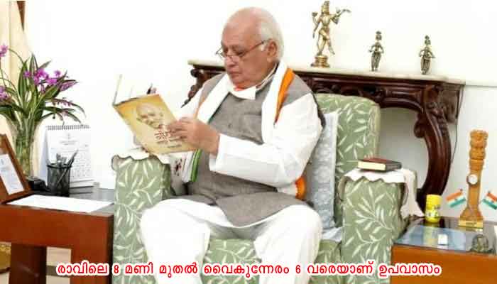 തിരുവനന്തപുരം: സ്ത്രീ സുരക്ഷിത കേരളത്തിന് വേണ്ടിയും സ്ത്രീധനത്തിനെതിരായും ഗവർണർ ആരിഫ് മുഹമ്മദ് ഖാൻ നടത്തുന്ന ഉപവാസ സമരത്തിന് 14/07/21 ബുധനാഴ്ച തുടക്കമായി. സംസ്ഥാന സർക്കാരിന്റെ തലവനായ ഗവർണർ ഇത്തരം ഒരു ആവശ്യം ഉന്നയിച്ച് ഉപവസിക്കുന്നത് അസാധാരണ നടപടിയാണ്. രാവിലെ 8 മണി മുതൽ വൈകുന്നേരം 6 വരെയാണ് ഉപവാസം.