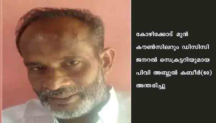 കോഴിക്കോട്‌ : കോഴിക്കോട്‌ മുന്‍ കൗണ്‍സിലറും ഡിസിസി ജനറല്‍ സെക്രട്ടറിയുമായ പിവി അബ്ദുല്‍ കബീര്‍(60) അന്തരിച്ചു. ബൈക്കപകടത്തില്‍ പരിക്കേറ്റ്‌ ചികിത്സയിലായിരുന്നു. 2021 ജൂലൈ 14ന്‌ ഉച്ചക്ക്‌ ടാഗോര്‍സെന്റിനറി ഹാളിന്‌ സമീപം ബൈക്കുകള്‍ കൂട്ടിയടിച്ചായിരുന്നു അപകടം. ബൈക്കിന്‌ പിന്‍ സീറ്റിലിരുന്ന്‌ സഞ്ചരിക്കുകയായിരുന്നുഅബ്ദുല്‍ കബീര്‍. ബൈക്കോടിച്ചിരുന്ന കാട്ടുകുളങ്ങര സ്വദേശി നൗഷാദ്‌ മെഡിക്കല്‍ കോളേജ്‌ ആശുപത്രിയില്‍ ചികിത്സയിലാണ്‌.