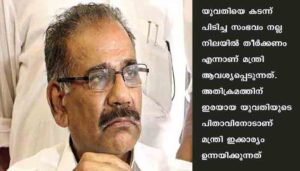 പഞ്ചായത്ത് തെരഞ്ഞെടുപ്പില് ബിജെപി സ്ഥാനാര്ത്ഥിയായിരുന്നു പരാതിക്കാരിയായ യുവതി. പ്രചാരണത്തിനിടെ യുവതിയെ ഹോട്ടലിലേക്ക് വിളിച്ചു വരുത്തി ഇയാൾ കൈയില് കടന്നു പിടിച്ചെന്നാണ് പരാതി. അന്നു തന്നെ പൊലീസില് പരാതി നല്കിയിരുന്നു. ഈ വിഷയം നല്ല നിലയില് തീര്ക്കണമെന്നാണ് യുവതിയുടെ അച്ഛനോട് മന്ത്രിയുടെ ആവശ്യം. കയ്യില് കടന്നുപിടിച്ചെന്ന പരാതിക്ക് പുറമെ യുവതിയുടെ പേരില് ഫെയ്ക്ക് ഐഡിയുണ്ടാക്കി മോശം പ്രചാരണം നടത്തിയെന്നും പരാതിയുണ്ട്.