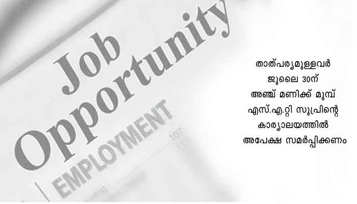 താത്പര്യമുള്ളവർ ജൂലൈ 30ന് അഞ്ച് മണിക്ക് മുമ്പ് എസ്.എ.റ്റി സൂപ്രണ്ടിന്റെ കാര്യാലയത്തിൽ അപേക്ഷ സമർപ്പിക്കണം. വിലാസം: സൂപ്രണ്ട്, എസ്.എ.റ്റി ആശുപത്രി, തിരുവനന്തപുരം. ഫോൺ: 0471-2528870.