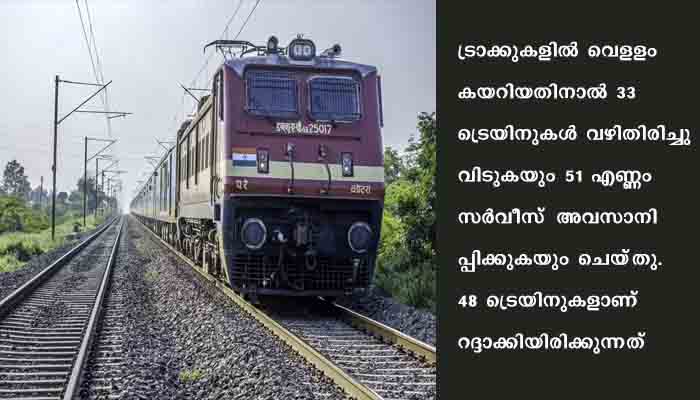 മുംബൈ : കനത്ത മഴയെ തുടര്‍ന്ന്‌ മഹാരാഷ്ട്രയിലെ കൊങ്കണ്‍ മേഖലയില്‍ ട്രെയിന്‍ ഗതാഗതം താറുമാറായി. ട്രാക്കുകളില്‍ വെളളം കയറിയതിനാല്‍ 33 ട്രെയിനുകള്‍ വഴിതിരിച്ചു വിടുകയും 51 എണ്ണം സര്‍വീസ്‌ അവസാനിപ്പിക്കുകയും ചെയ്‌തു. 48 ട്രെയിനുകളാണ്‌ റദ്ദാക്കിയിരിക്കുന്നത്‌. മുംബൈയില്‍ കാലാവസ്ഥാ വകുപ്പ്‌ റെഡ്‌ അലര്‍ട്ട്‌ പ്രഖ്യാപിച്ചിരിക്കുകയാണ്‌. . തുടര്‍ച്ചയായി പെയ്‌തുകൊണ്ടിരിക്കുന്ന മഴയെ തുടര്‍ന്ന്‌ കൊങ്കണ്‍ മേഖലയിലെ രത്‌നഗിരി ,റായ്‌ഗഡ്‌ ജില്ലകളിലെ പ്രധാന നദികള്‍ അപകടകരമാംവിധം കരകവിഞ്ഞൊഴുകുകയാണ്‌. ദുരിത ബാധികരെ സുരക്ഷിത സ്ഥലങ്ങളിലേക്ക് മാറ്റാാനുളള ശ്രമത്തിലാണ്‌ സര്‍ക്കാര്‍ സംവിധാനങ്ങളെല്ലാം.