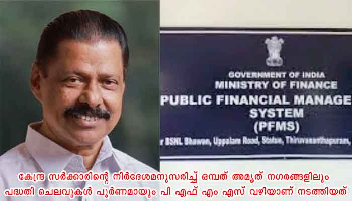 പതിനഞ്ചാം ധനകാര്യ കമ്മീഷൻ ശുപാർശ പ്രകാരം കേന്ദ്രാവിഷ്കൃത പദ്ധതികളുടെ പദ്ധതി വിഹിതം ചെലവഴിക്കുന്നത് പി എഫ് എം എസ് മുഖേനയാകണമെന്ന് കേന്ദ്ര സർക്കാർ നിർദേശിച്ചിരുന്നു. രണ്ട് കേന്ദ്രാവിഷ്കൃത പദ്ധതികളുടെ പണമിടപാടുകൾ സംബന്ധിച്ച വിവരങ്ങളും ചിലവുകളുടെ ക്രോഡീകരിച്ച വിവരങ്ങളും വിവിധ തലങ്ങളിലുള്ള പദ്ധതി നിർവഹണ ഏജൻസികളുടെ ധനവിനിയോഗ വിവരങ്ങളും ഗുണഭോക്താക്കൾക്ക് നേരിട്ട് പണം കൈമാറുന്നതിനുള്ള സൗകര്യങ്ങളുമൊക്കെ ലഭ്യമാക്കുന്ന വെബ് പോർട്ടലാണ് പി എഫ് എം എസ് സംവിധാനം. കേന്ദ്ര ധനകാര്യ മന്ത്രാലയത്തിന്റെ കീഴിൽ കൺട്രോളർ ജനറൽ ഓഫ് അക്കൗണ്ട്സിന്റെ നിയന്ത്രണത്തിലാണ് പി എഫ് എം എസ് പോർട്ടൽ. കേന്ദ്ര സർക്കാരിന്റെ നിർദേശമനുസരിച്ച് ഒമ്പത് അമൃത് നഗരങ്ങളിലും പദ്ധതി ചെലവുകൾ പൂർണമായും പി എഫ് എം എസ് വഴിയാണ് നടത്തിയതെന്ന് മന്ത്രി പറഞ്ഞു.