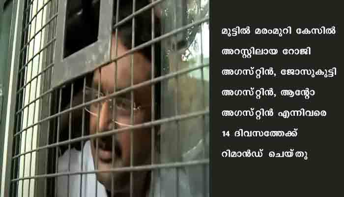 കൊച്ചി : മുട്ടില്‍ മരംമുറി കേസില്‍ അറസ്റ്റിലായ റോജി അഗസ്‌റ്റിന്‍, ജോസുകുട്ടി അഗസ്‌റ്റിന്‍, ആന്റോ അഗസ്‌റ്റിന്‍ എന്നിവരെ 14 ദിവസത്തേക്ക്‌ റിമാന്‍ഡ്‌ ചെയ്‌തു. സുര്‍ത്താന്‍ ബത്തേരി ജുഡീഷ്യല്‍ ഫസ്റ്റ്‌ക്ലാസ്‌ കോടതിയാണ്‌ പ്രതികളെ റിമാന്‍ഡ്‌ ചെയ്‌തത്‌. അതേസമയം മാതാവിന്റെ സംസ്‌കാര ചടങ്ങില്‍ പോലീസിന്റെ സാന്നിദ്ധ്യം പാടില്ലെന്ന്‌ ആവശ്യപ്പെട്ട പ്രതികള്‍ പോലീസിനോട്‌ കയര്‍ത്തു. തടര്‍ന്ന്‌ പോലീസ്‌ പ്രതികളെ മാനന്തവാടി ജില്ലാ ജയിലിലേക്ക്‌ കൊണ്ടുപോയി