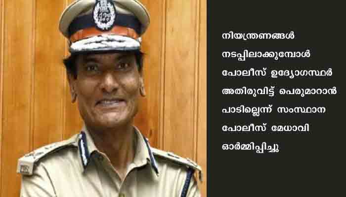 കോവിഡ്, ട്രാഫിക്ക് ഡ്യൂട്ടികള്‍ നടപ്പിലാക്കുന്ന പോലീസ് ഉദ്യോഗസ്ഥര്‍ പലപ്പോഴും വളരെ ബുദ്ധിമുട്ടേറിയ സാഹചര്യത്തിലാണ് ജോലി നോക്കേണ്ടിവരുന്നത്. എന്നാല്‍ നിയന്ത്രണങ്ങള്‍ നടപ്പിലാക്കുമ്പോള്‍ പോലീസ് ഉദ്യോഗസ്ഥര്‍ അതിരുവിട്ടു പെരുമാറാന്‍ പാടില്ലെന്ന് സംസ്ഥാന പോലീസ് മേധാവി ഓര്‍മ്മിപ്പിച്ചു. കോവിഡ്, ട്രാഫിക്ക് നിയന്ത്രണങ്ങളുടെ ചുമതല വഹിക്കുന്ന പോലീസ് ഉദ്യോഗസ്ഥരുടെ പെരുമാറ്റം അതിരുകടക്കുന്നതായ റിപ്പോര്‍ട്ടുകളുടെ അടിസ്ഥാനത്തിലാണ് ഈ നിര്‍ദ്ദേശം.