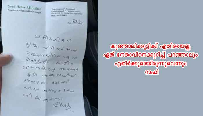 മുഈനലി തങ്ങളെ അസഭ്യം പറഞ്ഞതില് ഖേദം പ്രകടിപ്പിച്ചുകൊണ്ട് റാഫി പിന്നീട് രംഗത്തെത്തിയിരുന്നു. ഹൈദരലി തങ്ങളുടെ വിഷമങ്ങള്ക്ക് കാരണം മുഈനലിയാണ്. മുഈനലി ലീഗ് നേതാക്കളെ അനാവശ്യമായി വിമര്ശിച്ചത് കൊണ്ടാണ് വാര്ത്താസമ്മേളനത്തില് ഇടപെട്ടത്. കുഞ്ഞാലിക്കുട്ടിക്ക് എതിരെയല്ല, ഏത് നേതാവിനെക്കുറിച്ച് പറഞ്ഞാലും എതിര്ക്കുമായിരുന്നുവെന്നും റാഫി പറഞ്ഞിരുന്നു.