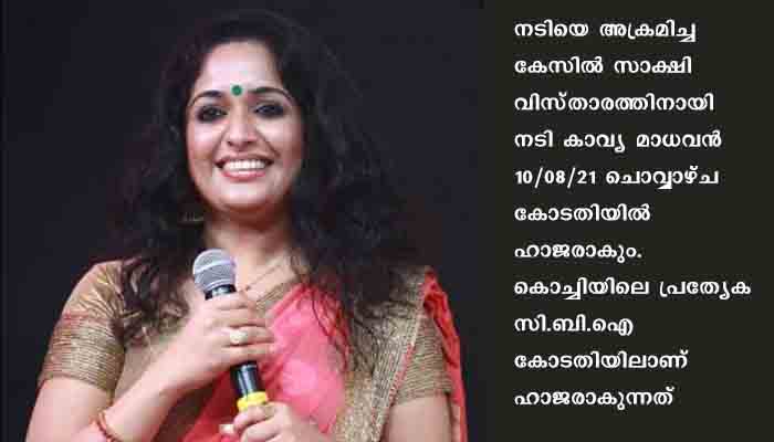 കൊച്ചി: നടിയെ അക്രമിച്ച കേസിൽ സാക്ഷി വിസ്താരത്തിനായി നടി കാവ്യ മാധവൻ 10/08/21 ചൊവ്വാഴ്ച കോടതിയിൽ ഹാജരാകും. കൊച്ചിയിലെ പ്രത്യേക സി.ബി.ഐ കോടതിയിലാണ് ഹാജരാകുന്നത്. കഴിഞ്ഞ മെയ് മാസത്തിൽ കാവ്യ കോടതിയിൽ എത്തിയിരുന്നെങ്കിലും അന്ന് വിസ്താരം നടന്നിരുന്നില്ല. കേസിൽ 178 പേരുടെ വിസ്താരമാണ് ഇതുവരെ പൂർത്തിയായിട്ടുള്ളത്.