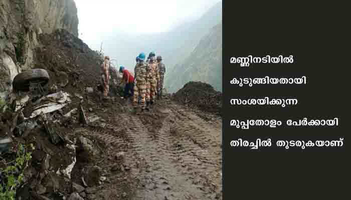 ഷിംല: ഹിമാചല് പ്രദേശിലെ കിനൗറില് ഹൈവേയില് വാഹനങ്ങള്ക്കു മുകളിലേക്ക് മണ്ണിടിഞ്ഞുണ്ടായ അപകടത്തില് മരിച്ചവരുടെ എണ്ണം 13 ആയി. മണ്ണിനടിയില് കുടുങ്ങിയതായി സംശയിക്കുന്ന മുപ്പതോളം പേര്ക്കായി തിരച്ചില് തുടരുകയാണ്. ഏതാനും വാഹനങ്ങളും മണ്ണിനടിയില് കുടുങ്ങിയിട്ടുണ്ട്. നേരത്തെ, പത്തു പേരെ രക്ഷപെടുത്തിയിരുന്നു.