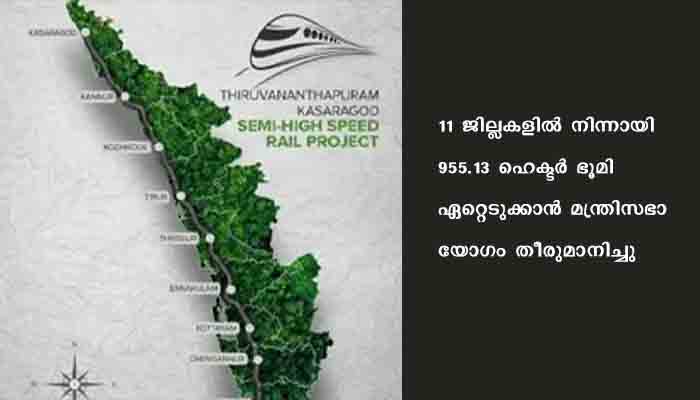 തിരുവനന്തപുരം: കെ റെയിൽ പദ്ധതിക്കായുള്ള ഭൂമി ഏറ്റെടുക്കലുമായി സർക്കാർ മുന്നോട്ട്. 11 ജില്ലകളിൽ നിന്നായി 955.13 ഹെക്ടർ ഭൂമി ഏറ്റെടുക്കാൻ മന്ത്രിസഭാ യോഗം തീരുമാനിച്ചു. റെയിൽവേ ബോർഡിൽ നിന്ന് പദ്ധതിക്കുള്ള അന്തിമ അനുമതി ലഭിക്കുന്ന മുറയ്ക്ക് അനുസരിച്ചാവും ഭൂമി ഏറ്റെടുക്കൽ.