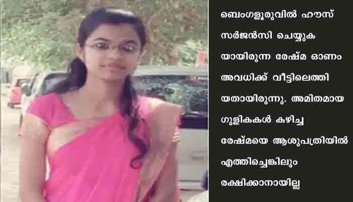 എടക്കര സ്വദേശിയായ ഒരു യുവാവുമായി അടുപ്പത്തിലായിരുന്നു ഡോ. രേഷ്മ. ആദ്യം വിവാഹത്തിന് സമ്മതിച്ചിരുന്ന ഇയാൾ അടുത്തിടെ പിൻമാറിയിരുന്നു. ഈ മനോവിഷമത്തിലാണ് രേഷ്മ ആത്മഹത്യ ചെയ്തതെന്നാണ് ബന്ധുക്കൾ പറയുന്നത്. വിശദമായ അന്വേഷണം വേണമെന്ന് കുടുംബം ആവശ്യപ്പെട്ടു