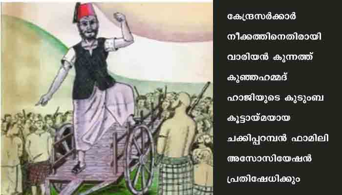 കേന്ദ്രസർക്കാർ നീക്കത്തിനെതിരായി വാരിയൻ കുന്നത്ത് കുഞ്ഞഹമ്മദ് ഹാജിയുടെ കുടുംബ കൂട്ടായ്മയായ ചക്കിപ്പറമ്പൻ ഫാമിലി അസോസിയേഷൻ പ്രതിഷേധിക്കും. 2021 ഓഗസ്റ്റ് 26ന് മലപ്പുറം പാസ്പോർട്ട് ഓഫീസിന് മുന്നിൽ കുടുംബാംഗങ്ങൾ പ്രതിഷേധ ധർണ്ണ നടത്തുമെന്നും കുടുംബം അറിയിച്ചു.