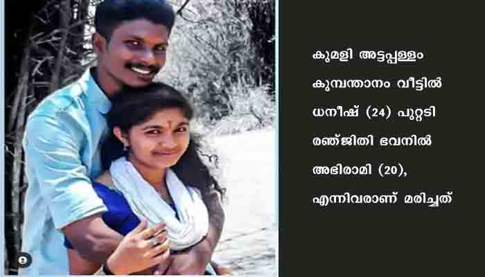 ഇടുക്കി: ഇടുക്കി കുമളിയില് ടൗണിലെ സ്വകാര്യ ലോഡ്ജിൽ കമിതാക്കളെ മരിച്ച നിലയിൽ കണ്ടെത്തി. കുമളി അട്ടപ്പള്ളം കുമ്പന്താനം വീട്ടിൽ ധനീഷ് (24) പുറ്റടി രഞ്ജിതി ഭവനിൽ അഭിരാമി (20), എന്നിവരാണ് മരിച്ചത്. വിഷം കഴിച്ച് അത്മഹത്യ ചെയ്തതാണെന്നാണ് പ്രാഥമിക നിഗമനം. 2021 ആഗസ്റ്റ് 30ന് ഉച്ചയോടെ താൻ ആത്മഹത്യ ചെയ്യാൻ പോകുകയാണെന്ന് ധനീഷ് ബന്ധുക്കളിലൊരാളെ ഫോണിൽ വിളിച്ച് അറിയിച്ചു. ബന്ധുക്കളും പോലീസും പല ഭാഗത്തായി തെരച്ചിൽ നടത്തി. തെരച്ചിലിന്റെ ഭാഗമായി ലോഡജുകളിൽ നടത്തിയ പരിശോധനയിലാണ് മൃതദേഹങ്ങൾ കണ്ടെത്തിയത്. ഇൻക്വസ്റ്റിനു ശേഷം പോസ്റ്റുമോർട്ടത്തിനായി മൃതദേഹങ്ങൾ മെഡിക്കൽ കോളജിലേക്ക് മാറ്റും.