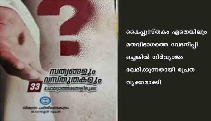 താമരശ്ശേരി: വിവാദ കൈപ്പുസ്തകത്തിൽ ഖേദം പ്രകടിപ്പിച്ച് താമരശ്ശേരി രൂപത. കൈപ്പുസ്തകം ഏതെങ്കിലും മതവിഭാഗത്തെ വേദനിപ്പിച്ചെങ്കിൽ നിർവ്യാജം ഖേദിക്കുന്നതായി രൂപത വ്യക്തമാക്കി.
