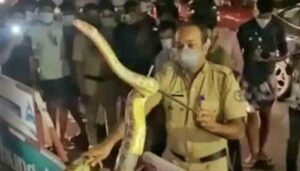 കൊച്ചി: കൊച്ചി മെട്രോ സ്റ്റേഷന് മുന്നിൽനിന്ന് കൂറ്റൻ പെരുമ്പാമ്പിനെ പിടികൂടി. ജവഹർലാൽ നെഹ്രു സ്റ്റേഡിയത്തിന് സമീപത്തെ മെട്രോ സ്റ്റേഷൻ പരിസരത്തുനിന്നാണ് പാമ്പിനെ പിടികൂടിയത്. പെരുമ്പാമ്പിനെ ശ്രദ്ധയിൽപ്പെട്ടതോടെ പൊലീസുകാരനായ സുനിൽ പി ജെയാണ് ഇതിനെ കയ്യോടെ പിടികൂടിയത്.