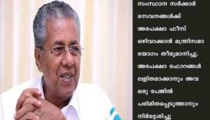 തിരുവനന്തപുരം: സംസ്ഥാന സര്ക്കാര് സേവനങ്ങള്ക്ക് അപേക്ഷാ ഫീസ് ഒഴിവാക്കാന് മന്ത്രിസഭാ യോഗം തീരുമാനിച്ചു. അപേക്ഷാ ഫോറങ്ങള് ലളിതമാക്കാനും അവ ഒരു പേജില് പരിമിതപ്പെടുത്താനും നിര്ദ്ദേശിച്ചു. ബിസിനസ്സ്, വാണിജ്യ ആവശ്യങ്ങള്ക്കുള്ള അപേക്ഷാഫീസ് തുടരും.