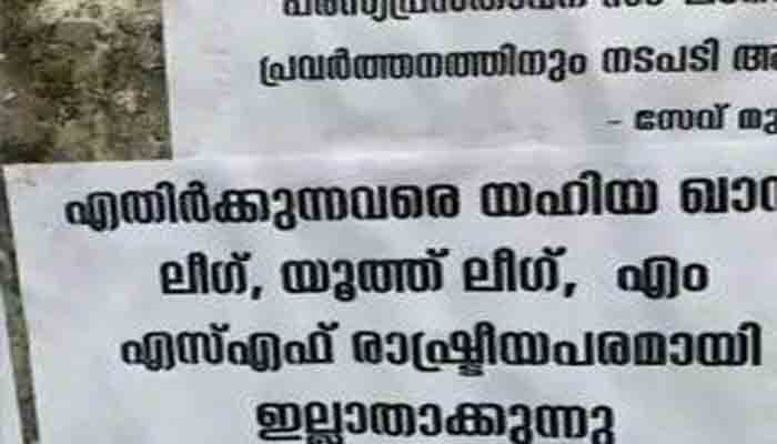 കല്പ്പറ്റ: വയനാട്ടില് മുസ്ലിം ലീഗ് നേതൃത്വത്തിനെതിരെ പോസ്റ്ററുകള്. സേവ് മുസ്ലിം ലീഗ് എന്ന പേരിലാണ് പോസ്റ്ററുകള് പതിച്ചിരിക്കുന്നത്.