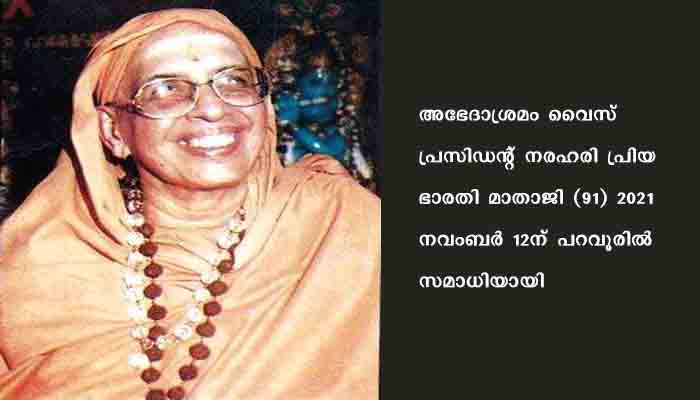 തിരുവനന്തപുരം: അഭേദാശ്രമം വൈസ് പ്രസിഡന്റ് നരഹരി പ്രിയ ഭാരതി മാതാജി (91) 2021 നവംബർ 12ന് പറവൂരിൽ സമാധിയായി. സംസ്കാര ചടങ്ങുകൾ ഇന്ന് രാവിലെ 10.30ന് മരിയാപുരത്തുള്ള ആറയൂർ അഭേദാശ്രമത്തിൽ നടക്കും.