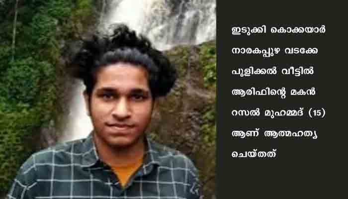 ഇടുക്കി: അമിതമായി മൊബൈല് ഫോണ് ഉപയോഗിക്കുന്നത് ചോദ്യം ചെയ്തതിന് പിന്നാലെ വിദ്യാര്ത്ഥി ജീവനൊടുക്കി. ഇടുക്കി കൊക്കയാർ നാരകപ്പുഴ വടക്കേപുളിക്കല് വീട്ടിൽ ആരിഫിന്റെ മകൻ റസൽ മുഹമ്മദ് (15) ആണ് ആത്മഹത്യ ചെയ്തത്. പത്താം ക്ലാസ് വിദ്യാര്ത്ഥിയായ റസല് മൊബൈല് അമിതമായി ഉപയോഗിക്കുന്നത് രക്ഷിതാക്കള് ചോദ്യം ചെയ്തിരുന്നു.