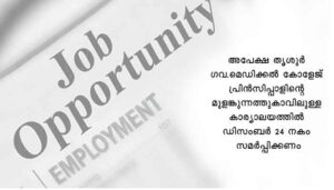തൃശൂർ ഗവ.മെഡിക്കൽ കോളേജിലെ മൈക്രോബയോളജി വകുപ്പിന് കീഴിലുള്ള VRDL ലേക്ക് ഡാറ്റ എൻട്രി ഓപ്പറേറ്റർ, മൾട്ടി ടാസ്കിംഗ് സ്റ്റാഫ് തസ്തികകളിൽ നിയമനം നടത്തുന്നു. ഒരു വർഷത്തേയ്ക്ക് കൺസോളിഡേറ്റഡ് വേതനത്തിൽ കരാർ അടിസ്ഥാനത്തിലാണ് നിയമനം. താൽപര്യമുള്ള ഉദ്യോഗാർത്ഥികൾ വയസ്, യോഗ്യത, പ്രവർത്തിപരിചയം എന്നിവ തെളിയിക്കുന്ന സർട്ടിഫിക്കറ്റുകളുടെ പകർപ്പ് സഹിതം അപേക്ഷ തൃശൂർ ഗവ.മെഡിക്കൽ കോളേജ് പ്രിൻസിപ്പാളിന്റെ മുളങ്കുന്നത്തുകാവിലുള്ള കാര്യാലയത്തിൽ ഡിസംബർ 24 നകം സമർപ്പിക്കണം. ഫോൺ: 0487- 2200310, ഇമെയിൽ : Principalmctcr@gmail.com