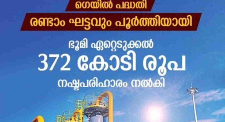 സംസ്ഥാനത്തിലെ ഊർജ്ജലഭ്യതയിൽ മുന്നേറ്റം സൃഷ്ടിക്കുന്ന ഗെയിൽ വാതക പൈപ്പ് ലൈൻ രണ്ടാംഘട്ട നിർമാണ പ്രവൃത്തികളും പൂർത്തിയായി. മൊത്തം 514 കി.മീ ദൈർഘ്യമുള്ള ഗെയിൽ പൈപ്പ് ലൈനിനായി ഏറ്റെടുത്ത ഭൂമിയുടെ ഉടമസ്ഥാവകാശം രേഖാ മൂലം തെളിയിച്ച എല്ലാ ഭൂവുടമകൾക്കും നഷ്ടപരിഹാരം നൽകിക്കഴിഞ്ഞതായി മുഖ്യമന്ത്രി പിണറായി വിജയൻ അറിയിച്ചു. പ്രമാണങ്ങൾ ഹാജരാക്കുന്ന മുറയ്ക്ക് ബാക്കിയുള്ളവർക്കും നഷ്ടപരിഹാരം നൽകി വരുന്നു. 404 കോടി രൂപ ഭൂമി ഏറ്റെടുക്കാനായി വകയിരുത്തുകയും അതിൽ 372 കോടി രൂപ നഷ്ടപരിഹാരമായി വിതരണം ചെയ്യുകയും ചെയ്തു.