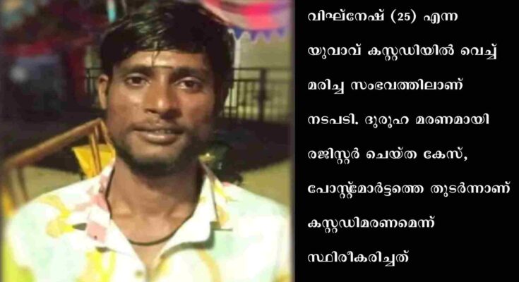 ചെന്നൈ: തമിഴ്‌നാട്ടിൽ യുവാവ് പോലീസ് കസ്റ്റഡിയിൽ മരിച്ച സംഭവത്തിന് ഉത്തരവാദികളായ ആറ് പോലീസുകാരെ അറസ്റ്റ് ചെയ്തു. പോലീസ് അറസ്റ്റ് ചെയ്ത വിഘ്നേഷ് (25) എന്ന യുവാവ് കസ്റ്റഡിയിൽ വെച്ച് മരിച്ച സംഭവത്തിലാണ് നടപടി. ദുരൂഹ മരണമായി രജിസ്റ്റർ ചെയ്ത കേസ്, പോസ്റ്റ്‌‍‍മോർട്ടത്തെ തുടർന്നാണ് കസ്റ്റഡിമരണമെന്ന് സ്ഥിരീകരിച്ചത്. തുടർന്ന് പോലീസുകാർക്കെതിരെ നടപടി സ്വീകരിക്കുകയായിരുന്നു. വിഘ്നേഷിന്റെ ശരീരത്തിൽ 13 മുറിവുകൾ ഉണ്ടായിരുന്നതായി പോസ്റ്റ്മോർട്ടം റിപ്പോർട്ടിൽ വ്യക്തമായിരുന്നു.