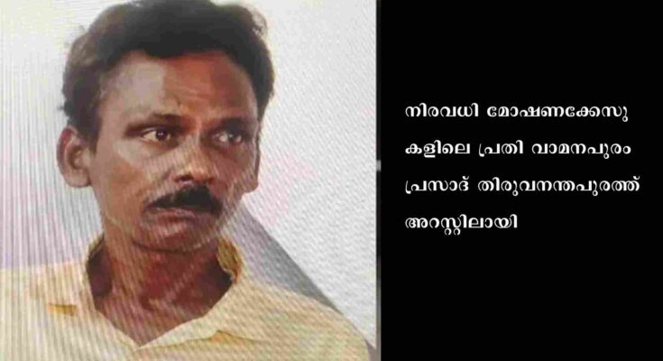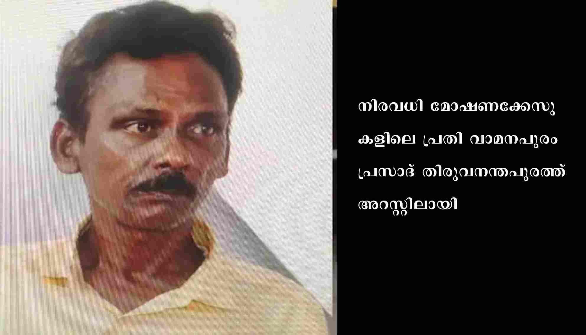 തിരുവനന്തപുരം: നിരവധി മോഷണക്കേസുകളിലെ പ്രതി വാമനപുരം പ്രസാദ് തിരുവനന്തപുരത്ത് അറസ്റ്റിലായി. വലിയതുറ പൊലീസാണ് പ്രസാദിനെ പിടികൂടിയത്. വലിയതുറ ഓൾ സെയ്ൻറ്സ് ഭാഗത്തെ പ്രവാസിയുടെ വീട് കുത്തിത്തുറന്ന് സ്വർണാഭരണങ്ങൾ മോഷ്ടിച്ച കേസിലാണ് പ്രസാദ് കുടുങ്ങുന്നത് .മുമ്പ് പത്ത് കേസുകളിൽ ജയിൽശിക്ഷ അനുഭവിച്ചിട്ടുണ്ട്.നെടുമങ്ങാട് വാമനപുരം അമ്പലമുക്ക് സ്വദേശിയാണ് പ്രസാദ്.