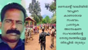 സൈലന്റ് വാലി : കേരള വനം വകുപ്പിലെ വാച്ചർ പി.പി. രാജനെ ( 55 ) മണ്ണാർക്കാട് സൈലന്റ് വാലി നാഷണൽ പാർക്കിൽ നിന്നും കാണാതായി. കാണാതായ രാജനെ കണ്ടെത്താൻ ഉള്ള തിരച്ചിൽ തുടരും. പ്രത്യേകസംഘം അന്വേഷണം ഏകോപിപ്പിക്കുന്നുണ്ട്. തമിഴ്നാട് വന മേഖലയിലേക്കും രാജന് വേണ്ടിയുള്ള തിരച്ചിൽ വ്യാപിപ്പിച്ചിട്ടുണ്ട്.