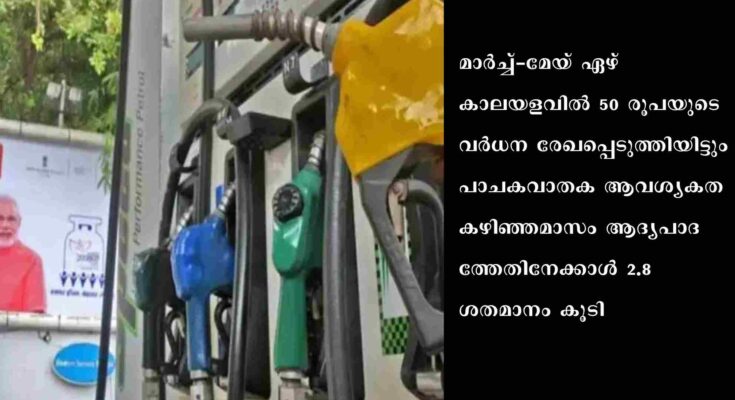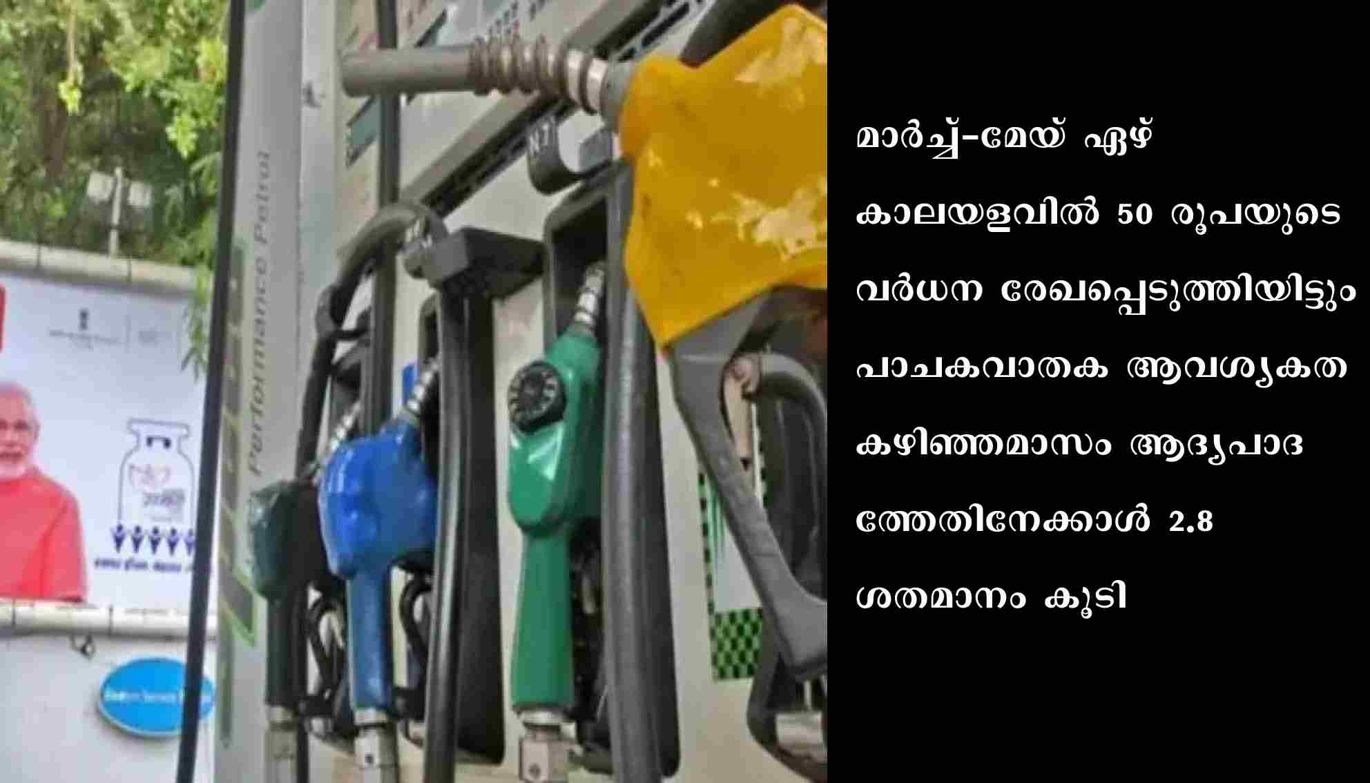 മാര്ച്ച്-മേയ് ഏഴ് കാലയളവില് 50 രൂപയുടെ വര്ധന രേഖപ്പെടുത്തിയിട്ടും പാചകവാതക ആവശ്യകത കഴിഞ്ഞമാസം ആദ്യപാദത്തേതിനേക്കാള് 2.8 ശതമാനം കൂടി. ഏപ്രില് ആദ്യപാദത്തില് 1.02 ദശലക്ഷം ടണ്ണായിരുന്ന വില്പ്പന മേയ് ഒന്ന് – 15 വരെ 1.05 ദശലക്ഷം ടണ്ണായി.