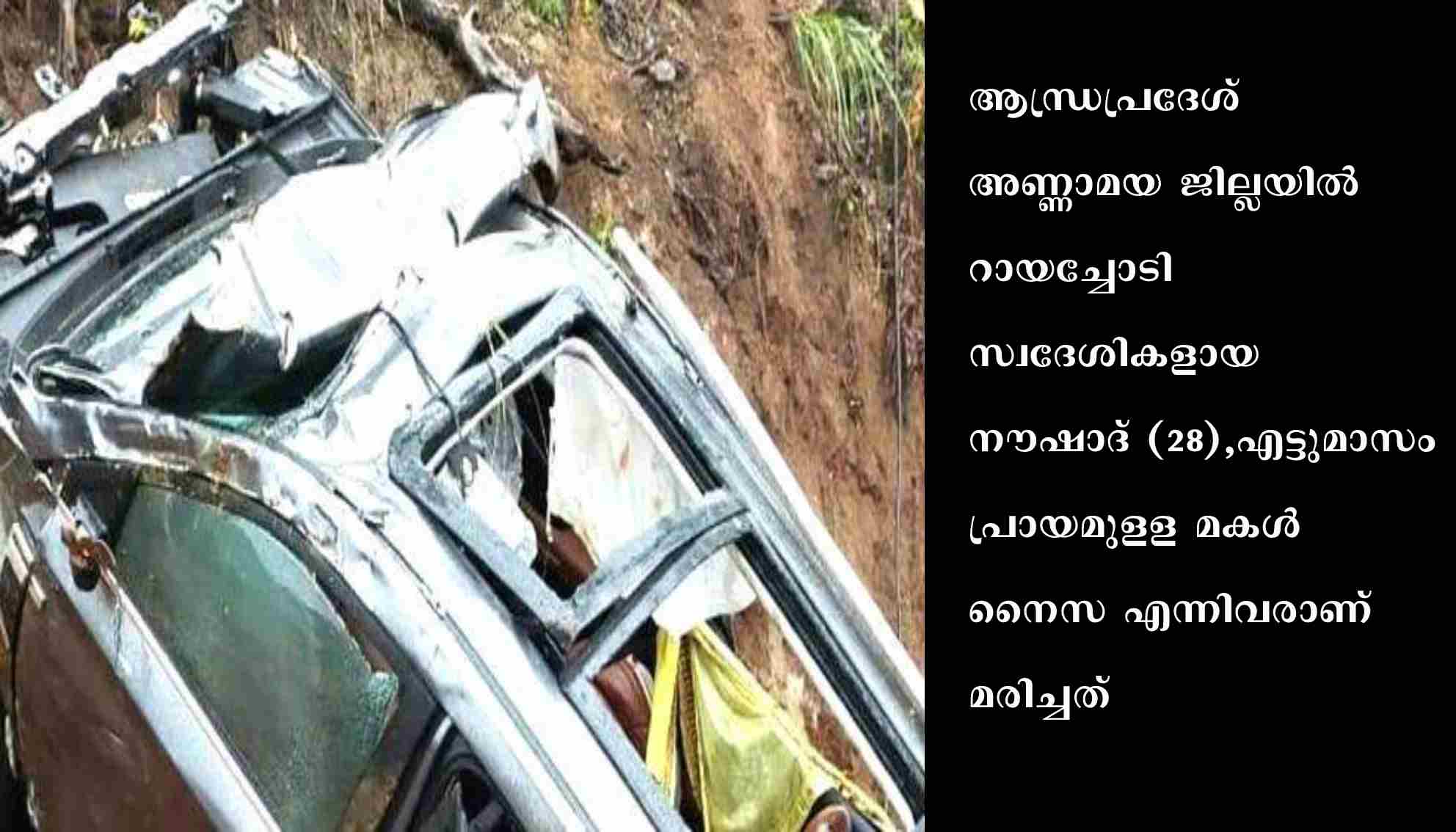 മൂന്നാര് : 200 അടി താഴ്ചയിലേക്ക് കാര് മറിഞ്ഞ് കൈക്കുഞ്ഞുള്പ്പെട രണ്ടുപേര് മരിച്ചു. ദേവികുളം -ലാക്കാട് ഗ്യാപ്പ് റോഡിലാണ് അപകടമനുണ്ടായത്. ആന്ധ്രപ്രദേശ് അണ്ണാമയ ജില്ലയില് റായച്ചോടി സ്വദേശികളായ നൗഷാദ് (28),എട്ടുമാസം പ്രായമുളള മകള് നൈസ എന്നിവരാണ് മരിച്ചത്. നൈസ സംഭവസ്ഥലത്തുവച്ചും നൗഷാദ് ആശുപത്രിയിലേക്കുളള യാത്രാമദ്ധ്യേയുമാണ് മരിച്ചത്. പരിക്കേറ്റവരെ മൂന്നാറിലെ ടാറ്റാ ജനറല് ആശുപത്രിയില് പ്രവേശിപ്പിച്ചു.