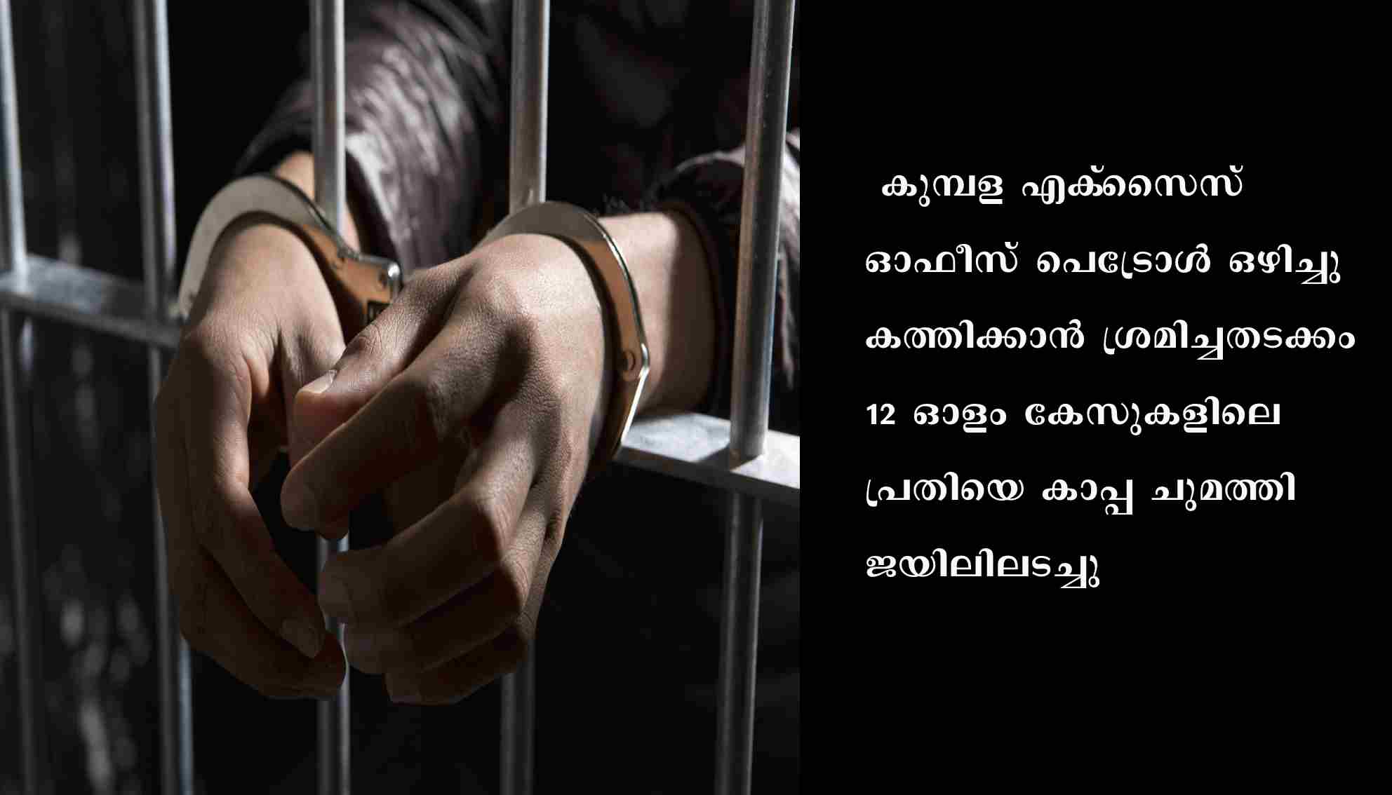 കാസര്‍കോട്‌: കുമ്പള എക്‌സൈസ്‌ ഓഫീസ്‌ പെട്രോള്‍ ഒഴിച്ചു കത്തിക്കാന്‍ ശ്രമിച്ചതടക്കം 12 ഓളം കേസുകളിലെ പ്രതിയെ കാപ്പ ചുമത്തി ജയിലിലടച്ചു. കുമ്പള കുണ്ടങ്കാരടുക്കയിലെ പ്രഭാകരന്‍ എന്ന അണ്ണിപ്രഭാകര (53)നെതിരെയാണ്‌ കുമ്പള പോലീസിന്റെ നടപടി. നിരവധി അബ്‌ക്കാരി കേ്‌സുകളില്‍ പ്രതിയാണ്‌ പ്രഭാകരന്‍. ഒരുമാസം മുമ്പാണ്‌ കുമ്പള എക്‌്‌സൈസ്‌ ഓഫീസിനകത്ത്‌ പെട്രോളൊഴിക്കുകയും പുറത്തുനിര്‍ത്തിയിട്ട ജീപ്പു തകര്‍ക്കുകയും ചെയ്‌തത്‌. ഈ കേസില്‍ കുമ്പള പോലീസ്‌ ആശുപത്രിയില്‍ നിന്ന്‌ ബലപ്രയോഗത്തിലൂടെ കീഴടക്കിയ പ്രതി ഇതുവരെ ജയിയിലായിരുന്നു.