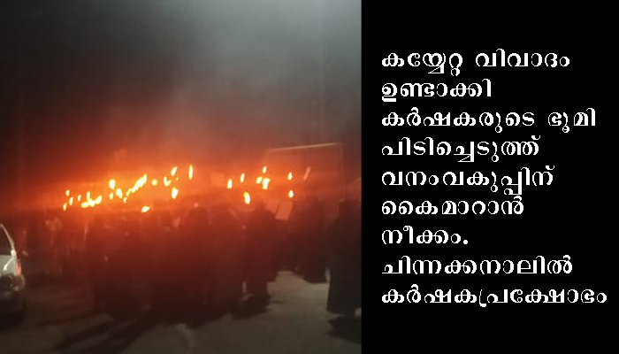 ഇടുക്കി : ചിന്നക്കനാലില് കര്ഷക പ്രക്ഷോഭം ശക്തിപ്പെടുന്നു. വനംവകുപ്പിന്റെ താത്പര്യത്തിനായി റവന്യൂ ഭൂമിയിലെ താമസക്കാരെ ഒഴിപ്പിക്കാനുള്ള നീക്കമാണ് കര്ഷകപ്രക്ഷോഭത്തിന് തിരികൊളുത്തിയത്. സ്ത്രീകളടക്കം നൂറുക്കണക്കിനാളുകള് പങ്കെടുത്ത പ്രകടനം തിങ്കളാഴ്ച (30-05-2022) വൈകീട്ട് 7 മണിക്ക് സിംഗുകണ്ടത്ത് നടന്നു.