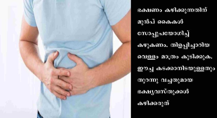 ഭക്ഷണം കഴിക്കുന്നതിന് മുന്‍പ് കൈകള്‍ സോപ്പുപയോഗിച്ച് കഴുകണം. തിളപ്പിച്ചാറിയ വെള്ളം മാത്രം കുടിക്കുക. ഈച്ച കടക്കാനിടയുള്ളതും തുറന്നു വച്ചതുമായ ഭക്ഷ്യവസ്തുക്കള്‍ കഴിക്കരുത്. കഴിയുന്നതും വീട്ടില്‍ പാകം ചെയ്യുന്ന ഭക്ഷണം കഴിക്കുക. പുറത്തു നിന്നും ഭക്ഷണം കഴിക്കേണ്ടി വരുമ്പോള്‍ വൃത്തിയുള്ള ഇടങ്ങളില്‍ നിന്നു മാത്രം കഴിക്കുക. പൂപ്പല്‍ ബാധിച്ച ഭക്ഷ്യ വസ്തുക്കള്‍ കഴിക്കരുത്. പാതിവെന്ത ഇറച്ചി/മുട്ട എന്നിവ ഉപയോഗിച്ച് തയ്യാറാക്കാനിടയുള്ള ഭക്ഷ്യ വസ്തുക്കള്‍ ഒഴിവാക്കണം. പാകം ചെയ്യുമ്പോഴും വിളമ്പുമ്പോഴും ശ്രദ്ധിക്കണം.