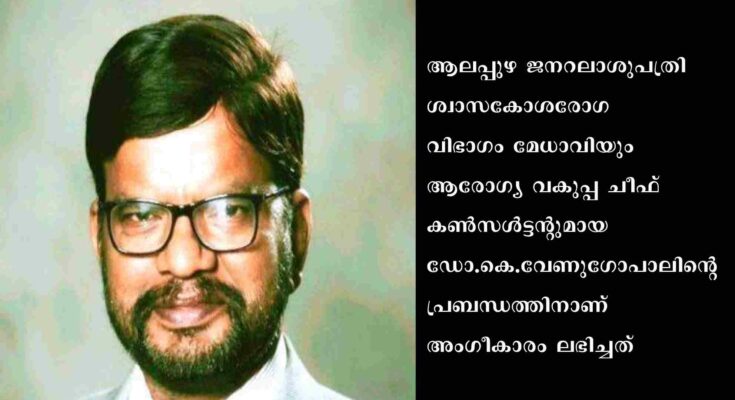 ആലപ്പുഴ :കോവിഡാനന്തര രോഗങ്ങളെ സംബന്ധിച്ച ഗവേഷണ പ്രബന്ധത്തിന് ലോകാരോഗ്യ സംഘടനയുടെ അംഗീകാരം. ആലപ്പുഴ ജനറലാശുപത്രി ശ്വാസകോശരോഗ വിഭാഗം മേധാവിയും ആരോഗ്യ വകുപ്പ ചീഫ് കണ്സള്ട്ടന്റുമായ ഡോ.കെ.വേണുഗോപാലിന്റെ പ്രബന്ധത്തിനാണ് അംഗീകാരം ലഭിച്ചത്. കഴിഞ്ഞ രണ്ടുവര്ഷക്കാലമായി ജനറല് ആശുപത്രിയില് നടന്ന കോവിഡാനന്തര രോഗങ്ങളുടെ പഠന ഫലങ്ങളെ ആസ്പദമാക്കി “ചെസ്റ്റ് ” ജേണലില് പ്രസിദ്ധീകരിച്ച അദ്ദേഹത്തിന്റെ ലേഖനത്തിനാണ് അംഗീകാരം.