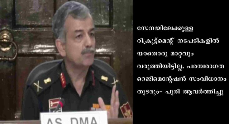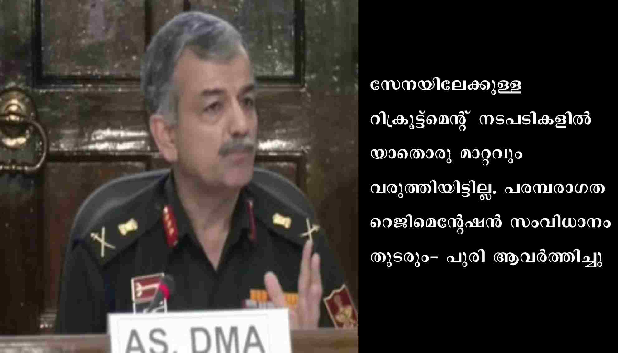 സേനയിലേക്കുള്ള റിക്രൂട്ട്മെന്റ് നടപടികളില് യാതൊരു മാറ്റവും വരുത്തിയിട്ടില്ല. പരമ്പരാഗത റെജിമെന്റേഷന് സംവിധാനം തുടരും- പുരി ആവര്ത്തിച്ചു. ഭാവി മുന്നില്ക്കണ്ട് വ്യക്തികളെ സജ്ജരാക്കുകയെന്ന ദൗത്യമാണ് അഗ്നിപഥിലൂടെ ലക്ഷ്യമിടുന്നത്. സേവനം അനുഷ്ഠിക്കാന് യുവാക്കളെ ആകര്ഷിക്കുന്നതിനൊപ്പം കൂടുതല് സാങ്കേതിക പരിജ്ഞാനമുള്ളവരുടെ സാന്നിധ്യം ഉറപ്പാക്കാനും പദ്ധതിയിലൂടെ സാധിക്കും. രാജ്യസുരക്ഷയില് വിട്ടുവീഴ്ചയ്ക്കു തയാറല്ല. അതിനാല് അഗ്നിവീരന്മാരാകാന് അപേക്ഷിക്കുന്നവര് അക്രമസംഭവങ്ങളില് പങ്കാളികളായിട്ടില്ലെന്ന സത്യവാങ്മൂലം സമര്പ്പിക്കണം- പുരി പറഞ്ഞു.