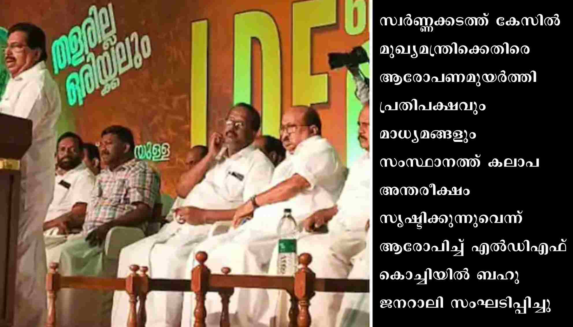 കൊച്ചി: സ്വർണ്ണക്കടത്ത് കേസിൽ മുഖ്യമന്ത്രിക്കെതിരെ ആരോപണമുയർത്തി പ്രതിപക്ഷവും മാധ്യമങ്ങളും സംസ്ഥാനത്ത് കലാപ അന്തരീക്ഷം സൃഷ്ടിക്കുന്നുവെന്ന് ആരോപിച്ച് എൽഡിഎഫ് കൊച്ചിയിൽ ബഹുജനറാലി സംഘടിപ്പിച്ചു. എൻസിപി സംസ്ഥാന അദ്ധ്യക്ഷൻ പി സി ചാക്കോ ആണ് പരിപാടി ഉദ്ഘാടനം ചെയ്തത്. ആരോപണങ്ങൾ വിലപ്പോവില്ലെന്നും മുഖ്യമന്ത്രിക്ക് ഓരോ എൽഡിഎഫ് പ്രവർത്തകനും പ്രതിരോധം തീർക്കുമെന്നും റാലി പ്രഖ്യാപിച്ചു. കോൺഗ്രസ് വിട്ട കെ വി തോമസ്, തൃക്കാക്കരയിലെ എൽഡിഎഫ് സ്ഥാനാർത്ഥി ജോ ജോസഫ് എന്നിവരും പരിപാടിക്കെത്തി