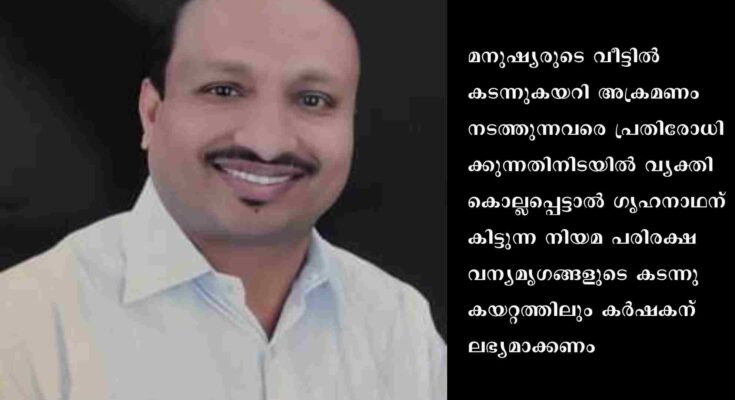 മനുഷ്യരുടെ വീട്ടില് കടന്നുകയറി അക്രമണം നടത്തുന്നവരെ പ്രതിരോധിക്കുന്നതിനിടയില് വ്യക്തി കൊല്ലപ്പെട്ടാൽ ഗൃഹനാഥന് കിട്ടുന്ന നിയമ പരിരക്ഷ വന്യമൃഗങ്ങളുടെ കടന്നുകയറ്റത്തിലും കര്ഷകന് ലഭ്യമാക്കണം. അപ്രകാരം കൊല്ലപ്പെടുന്ന മൃഗങ്ങളെ വനം വകുപ്പ് അധികാരികളുടെ നേതൃത്വത്തില് പരസ്യമായി ലേലം ചെയ്ത് ഭക്ഷ്യാവശ്യത്തിനായി നല്കുകയും ചെയ്താല് സാമ്പത്തിക നേട്ടം ഉണ്ടാക്കാന് കഴിയും. ഇതിന്റെ ഒരുവിഹിതം കര്ഷകനും ലഭ്യമാക്കണം. പിടിച്ചെടുക്കുന്ന കാട്ടുമൃഗങ്ങളെ കത്തിച്ചുകളയണമെന്ന നിയമം പരിഷ്കൃത സമൂഹത്തിന് അപമാനമാണെന്നും സാജു പട്ടരുമഠം പറഞ്ഞു.