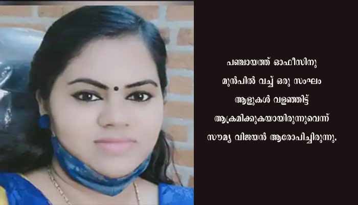 24/06/22 വെള്ളിയാഴ്ചയാണ് പുറമറ്റം പഞ്ചായത്ത് പ്രസിഡന്റ് സൗമ്യ വിജയന് നേരെയാണ് കയ്യേറ്റ ശ്രമം ഉണ്ടായത്. പഞ്ചായത്ത് ഓഫീസിനു മുൻപിൽ വച്ച് ഒരു സംഘം ആളുകൾ വളഞ്ഞിട്ട് ആക്രമിക്കുകയായിരുന്നുവെന്ന് സൗമ്യ വിജയൻ ആരോപിച്ചിരുന്നു. സ്ത്രീകളാണ് ശാരീരികമായി ആക്രമിച്ചതെന്നും സിപിഎം പഞ്ചായത്തംഗങ്ങളായ ഷിജു പി കുരുവിള, സാബു ബഹന്നാൻ എന്നിവരാണ് ആക്രമണം ആസൂത്രണം ചെയ്തതെന്നുമായിരുന്നു സൗമ്യയുടെ ആരോപണം. എന്നാൽ പ്രസിഡന്റ് പഞ്ചായത്ത് ഓഫീസിൽ എത്തിയപ്പോൾ പ്രതിഷേധിക്കുക മാത്രമാണ് ചെയ്തതായിരുന്നു സിപിഎമ്മിന്റെ വിശദീകരണം.