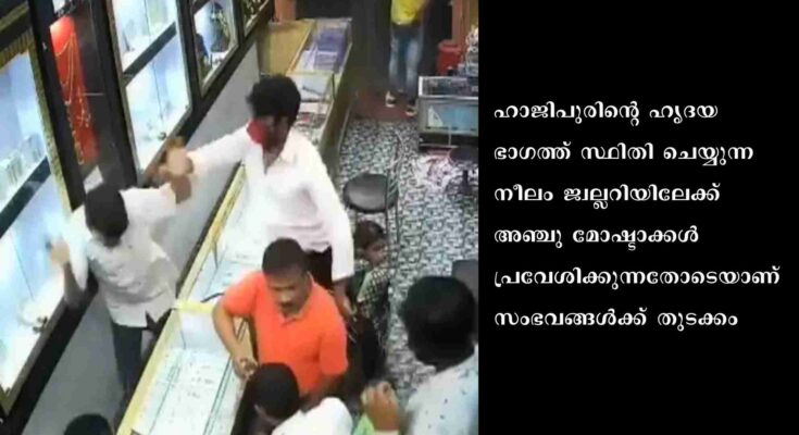 ന്യൂഡല്‍ഹി: ബിഹാറില്‍ ജ്വല്ലറി കൊള്ളയടിക്കാനെത്തിയ മോഷ്ടാക്കള്‍ ഉടമയെ വെടിവച്ചു കൊന്നു. മാരകായുധങ്ങളുമായി കവര്‍ച്ച നടത്തിയ സംഘത്തിന്റെ തേര്‍വാഴ്ച സി.സി.ടിവി ദൃശ്യങ്ങളില്‍. ബിഹാറിലെ ഹാജിപൂരില്‍ രാത്രിയാണ് സംഭവം.ഹാജിപുരിന്റെ ഹൃദയഭാഗത്ത് സ്ഥിതിചെയ്യുന്ന നീലം ജ്വല്ലറിയിലേക്ക് അഞ്ചു മോഷ്ടാക്കള്‍ പ്രവേശിക്കുന്നതോടെയാണ് സംഭവങ്ങള്‍ക്ക് തുടക്കം. അത്രയൊന്നും വലിപ്പമില്ലാത്ത സ്ഥാപനത്തിലേക്ക് ഓരോരുത്തരായാണു മോഷ്ടാക്കള്‍ പ്രവേശിക്കുന്നത്.ബാഗടക്കം പുറത്തുതൂക്കിയായിരുന്നു വരവ്. ഈസമയം കുട്ടികളടക്കം ഏതാനും പേര്‍ ജുവലറിയിലുണ്ടെന്നു സി.സി.ടിവിയില്‍ കാണാം. അകത്തു കടന്നയുടന്‍ അക്രമികള്‍ തോക്കു ചൂണ്ടി ഇടപാടുകാരെയും ജ്വല്ലറി ജീവനക്കാരെയും ഭീഷണിപ്പെടുത്തുന്നുണ്ട്.ഇടപാടുകാരിലൊരാളെ മോഷ്ടാക്കള്‍ മര്‍ദിക്കുന്നതും ദൃശ്യങ്ങളില്‍ കാണാം. ഇതിനിടെ ആഭരണങ്ങളടക്കം ബാഗിനുള്ളിലാക്കാനുള്ള ശ്രമം കടയുടമ സുനില്‍ പ്രിയദര്‍ശി ചെറുത്തു. ഇയാളെ പൊതിരെത്തല്ലി അവശനാക്കിയശേഷം അക്രമികള്‍ വെടി-വച്ച് കൊല്ലുന്നതും ദൃശ്യങ്ങളില്‍ വ്യക്തമാണ്.സംഭവത്തില്‍ ജില്ലാ പോലീസ് സൂപ്രണ്ട് അടിയന്തര അന്വേഷണത്തിന് ഉത്തരവിട്ടു. കേസുമായി ബന്ധപ്പെട്ട് ഇതുവരെ ആരെയും അറസ്റ്റ് ചെയ്തിട്ടില്ല.
