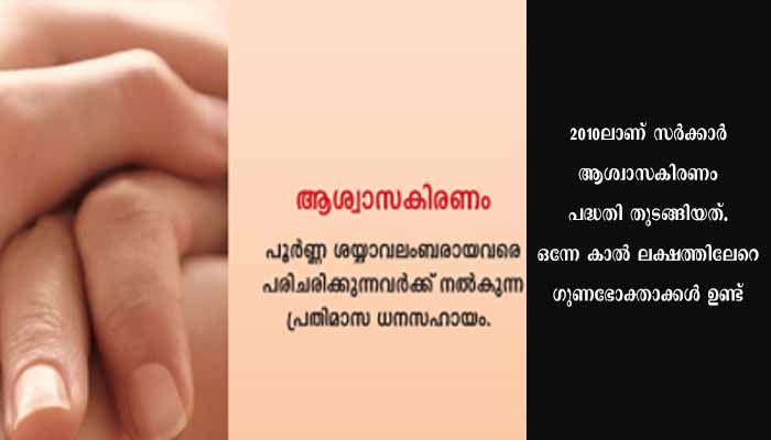 ഇവർക്ക് ആശ്വാസമായിരുന്നത് സാമൂഹ്യ സുരക്ഷാ മിഷന്റെ ആശ്വാസകിരണം പദ്ധതി ആയിരുന്നു. ശാരീരിക മാനസിക വെല്ലുവിളി നേരിടുന്നവർ പരിചരിക്കുന്നവർക്ക് സർക്കാർ നൽകുന്ന ധനസഹായം ആണ് ആശ്വാസകിരണം പദ്ധതി. 2010ലാണ് സർക്കാർ ആശ്വാസകിരണം പദ്ധതി തുടങ്ങിയത്. ഒന്നേ കാൽ ലക്ഷത്തിലേറെ ഗുണഭോക്താക്കൾ ഉണ്ട് . 600 രൂപയാണെങ്കിലും ഒരു ജോലിക്കും പോകാൻ കഴിയാതെ രോഗികളെ പരിചരിക്കുന്നവർക്ക് അതൊരു വലിയ ആശ്വാസമായിരുന്നു .ആറുമാസത്തിലേറെയായി ആശ്വാസകിരണം പദ്ധതി നിലച്ചിട്ട്. ഈ വർഷം ഇതുവരെ പണം കിട്ടിയിട്ടില്ലെന്ന് അർഹരായവർ പറയുന്നു.